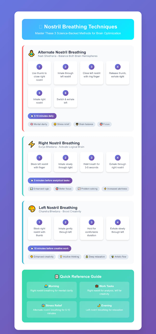 Start your nostril breathing journey today: Choose one technique from this article and practice it for just 5 minutes. Notice the immediate effects on your mental clarity and emotional state. Your brain optimization journey begins with a single conscious breath.