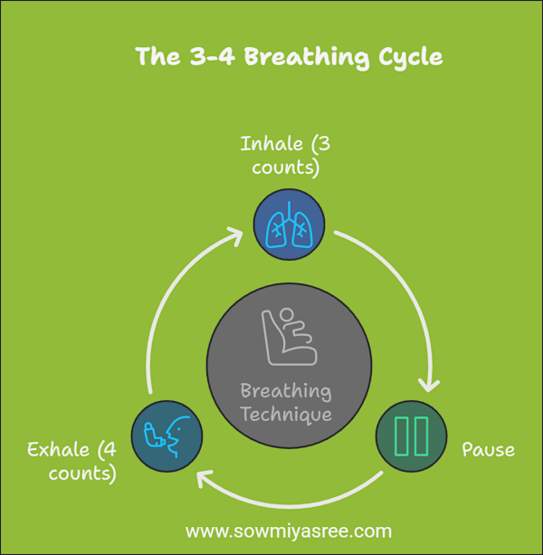 [Image: Circular diagram showing the 3-4 breathing technique: Inhale (3 counts) → Pause → Exhale (4 counts)]