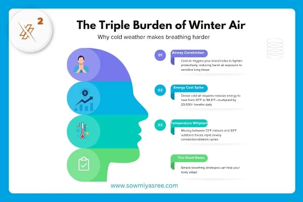 - Cold air makes breathing harder in three ways: airways constrict, energy costs spike, and rapid indoor-outdoor temperature changes stress your system